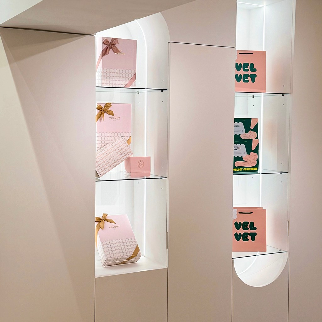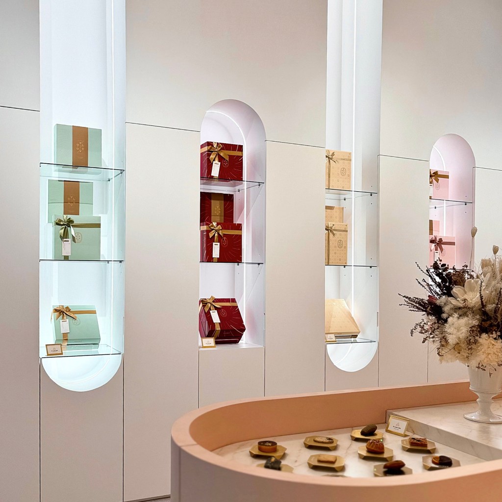 法絨體驗門市位在高雄市美術館附近,白色的門面散發優雅氣息,還沒入店就被吸引目光。踏入店內更是被輕鬆浪漫的氛圍環繞,粉色系裝潢搭配柔和燈光,帶給前來挑選喜餅的新人一種由內而外的溫暖和煦感。牆面陳列著多款禮盒,中間是可愛的甜點展示區,一般消費者也能入店購買零售的糕點。