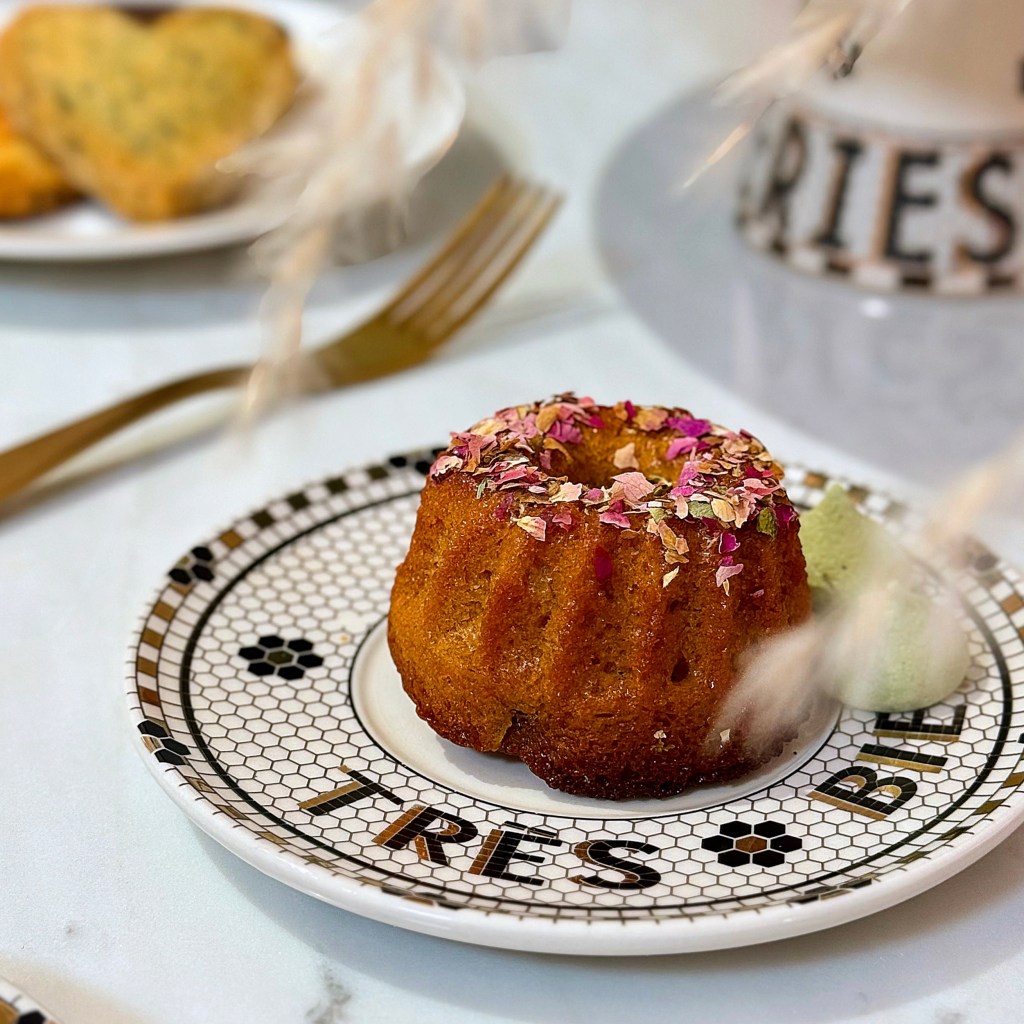 做成咕咕霍夫造型的玫瑰焦糖蘋果小旅人,質地紮實濕潤、奶油香氣濃郁。青蘋果的清新、焦糖鹽之花的香甜、伴隨玫瑰尾韻,是款優雅的仕女蛋糕。