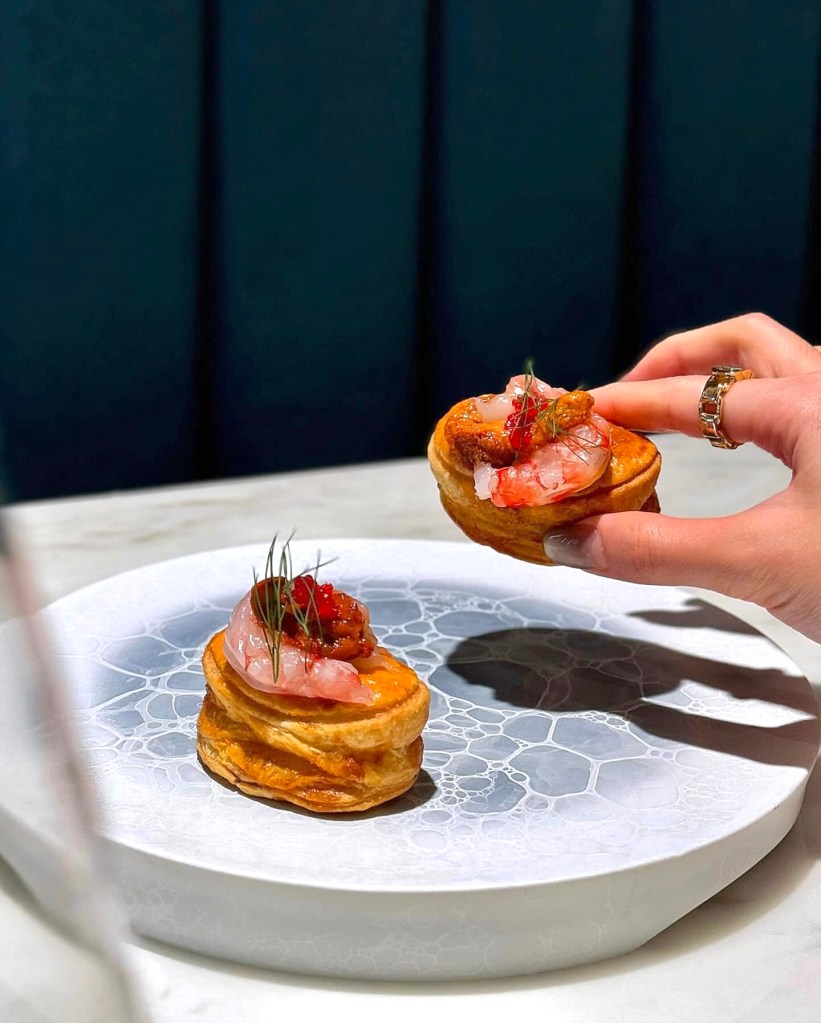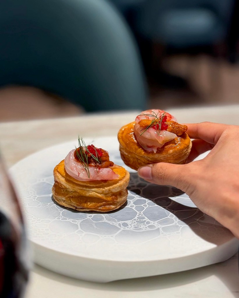 金黃色的小酥盒吃在口中酥鬆輕盈,胭脂蝦的鮮美及海膽醬的濃郁同時迸發,中間的葡萄是隱藏驚喜,是款風味層次豐富的Finger food。