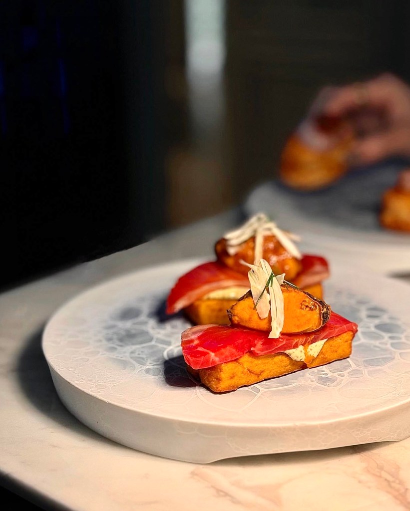 長型小點以南法小食Panisse(油炸鷹嘴豆條)為底,堆疊上厚切煙燻鮭魚和新鮮淡菜,濃郁帶點微酸的莫雷拉醬串起風味鏈,第一次吃到這樣的味道,非常特別。
